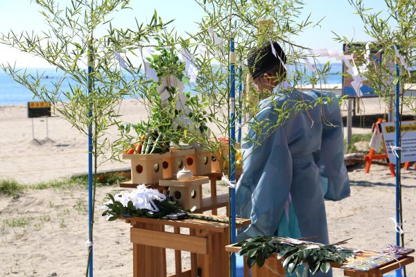 ・静波海水浴場 15:00~神事開始。その後、ライフセーバーによる水難救助のデモンストレーション予定。
